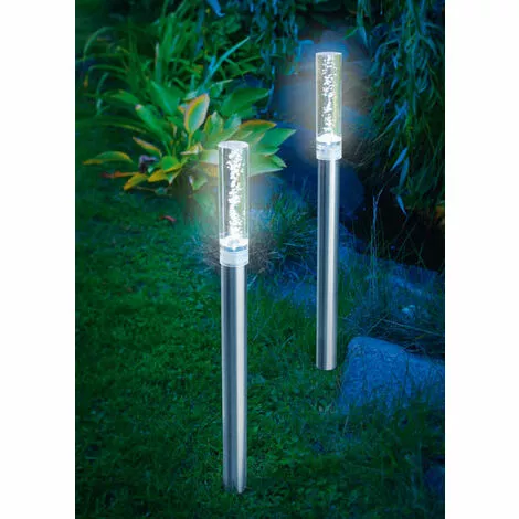 Transformez vos allĂ©es de jardin, les espaces de loisirs ou votre patio en un Ă©lĂ©ment de jardin vraiment attrayant. Les lampadaires Esotec se chargent tout au long de la journĂ©e en utilisant l’Ă©nergie solaire, le soir, ils Ă©mettent une lueur blanche et fraĂźche, illuminant votre jardin.Les lumiĂšres LED s’allument automatiquement pendant la soirĂ©e et s’Ă©teignent Ă l’aube. Un effet de bulle dans le tube d’Ă©clairage crĂ©e un effet unique et magnifique lorsque les lumiĂšres sont allumĂ©es. Ă charge complĂšte, les lumiĂšres peuvent fonctionner jusqu’Ă 8 heures avant d’avoir besoin de se recharger.Barre lumineuse avec bulles d’air fermĂ©esConstruction en acier inoxydable avec pointe de terre.Ensemble de 2 piĂšcesTension de fonctionnement : 1,2 VCouleur de la lumiĂšre : 6500 K (blanc froid)Puissance du module solaire : 30 mWProtection contre les intempĂ©ries : IP 44Temps d’Ă©clairage : Max. 8 heures.Batterie : 1x NiMh 1,2 V / 600 mAh.Dimensions : 35 x 500 mmPoids : 330 g